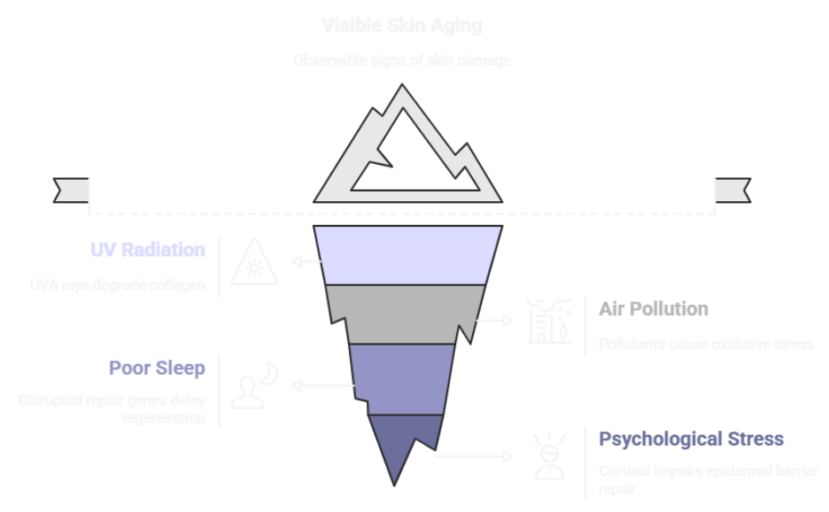 Skin aging isn’t a single process but an accumulation of molecular stressors and systemic shifts.
